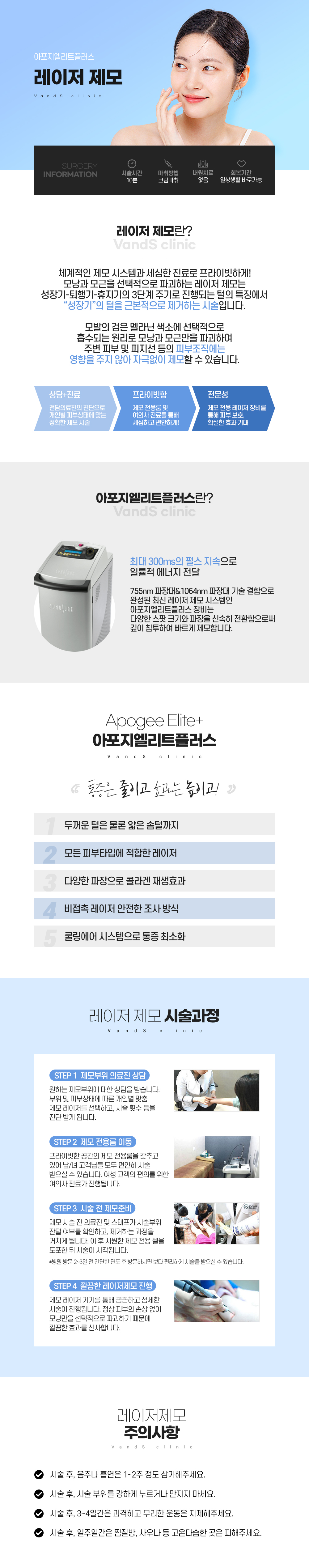 깔끔하게 털 제거를 원하는 모든 부위(얼굴/바디)에 시술 가능하며 짧은 시술시간과 적은 통증으로 간편하게 제모할 수 있습니다.